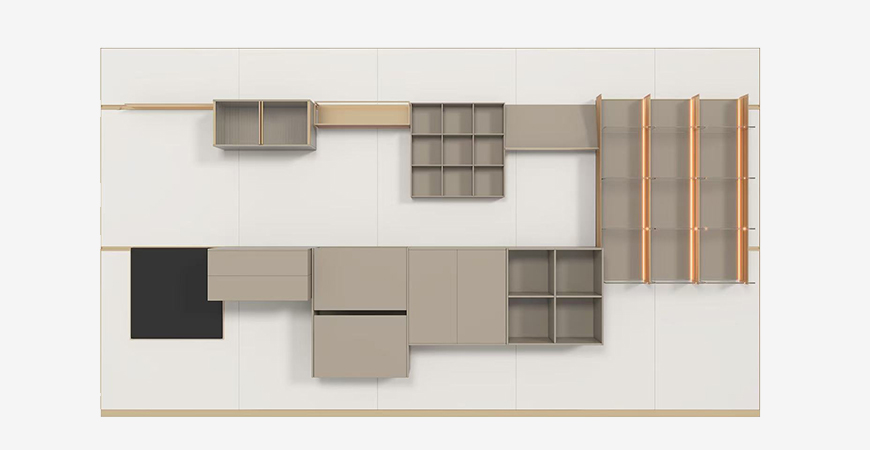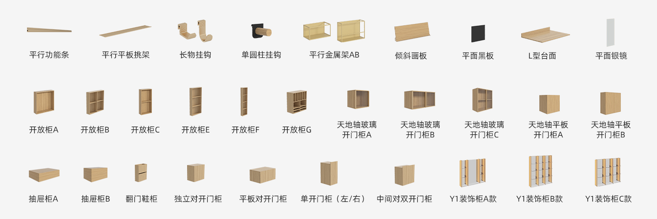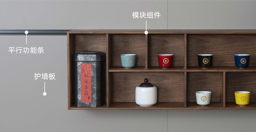 平行系列由護(hù)墻板、平行功能條和模塊組件構(gòu)成。 無需打底或龍骨,占用空間小、安裝快捷、承重高,更高空間利用率。
