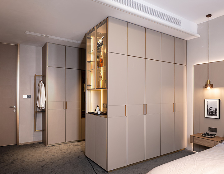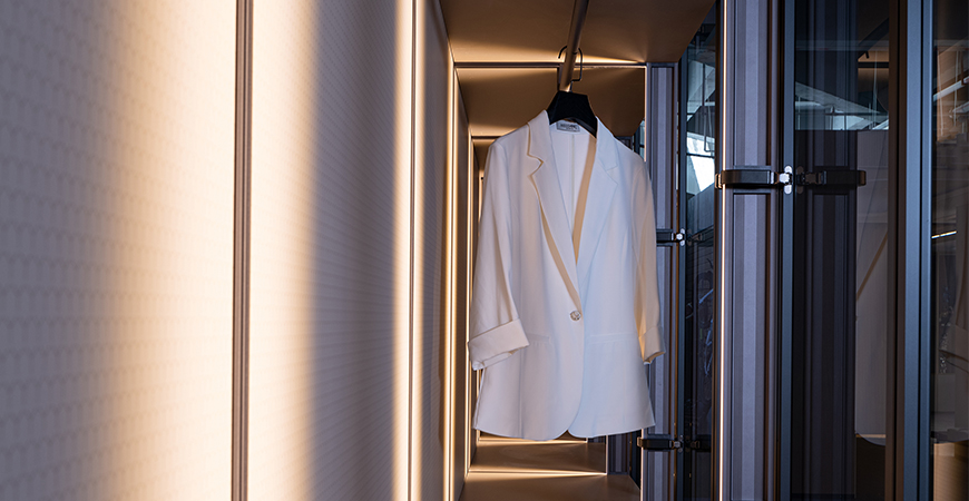 柜內線燈位于立柱槽口向內照射,不刺眼,且光線不會被懸掛的衣物等收納物品遮擋,方便物品的取用。